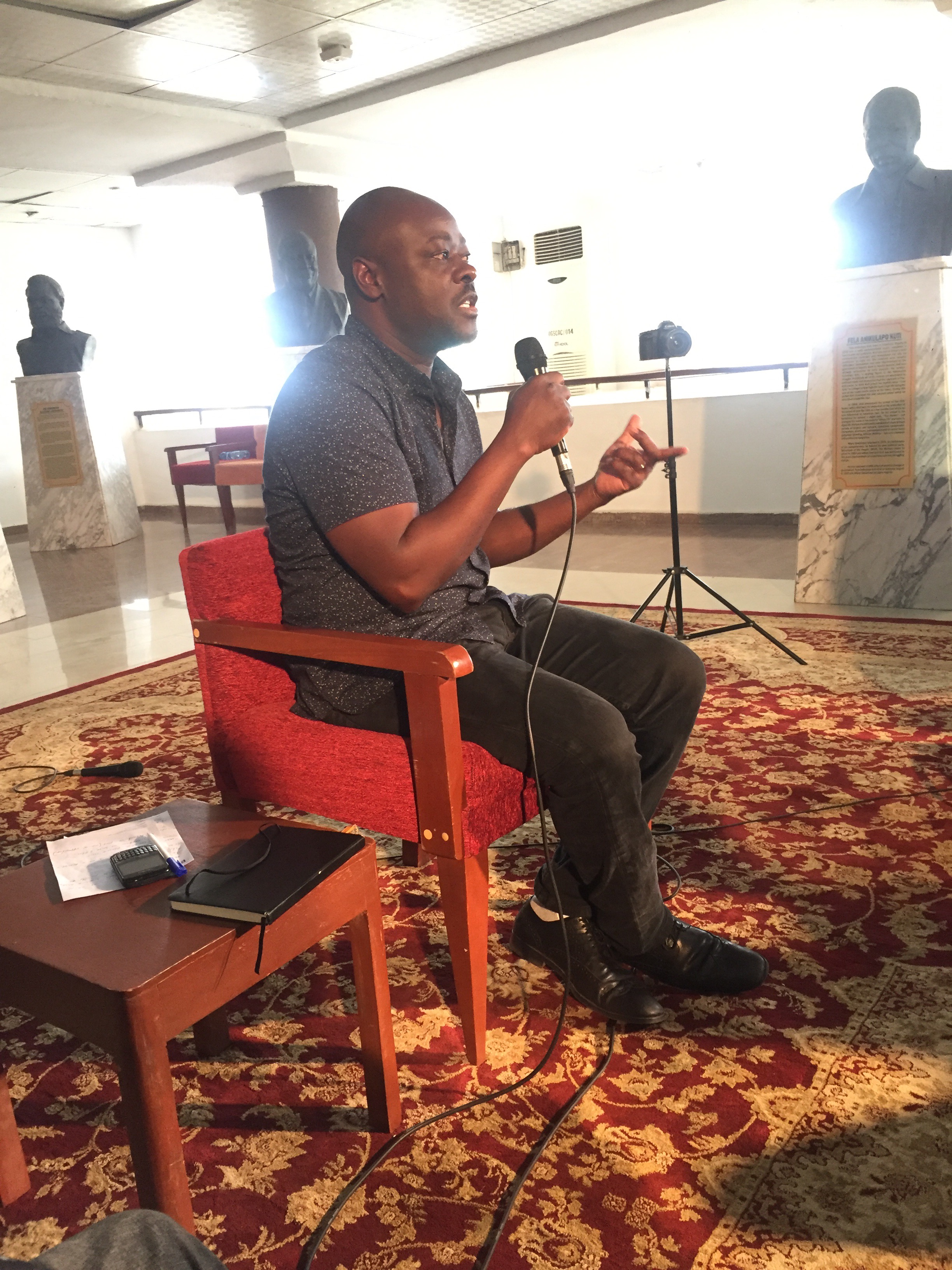 At 8:30am, I leave my hotel room to find my way to the cultural center. A huge bus pulls into the compound just before I get to the gate and the man driving asks me to join them If I’m headed to the June 12 cultural center. Apparently, the bus is there to pick up the actors for Friday’s stage play. I get into the bus before most of the actors do. They soon notice the stranger in their midst and nothing could have prepared me for the questions and love and more questions I was barraged with. They are so many, I can’t possibly remember their names. I remember Rotimi, Tunji, Debby, Titi and several other ‘crazy’ people. I say crazy in the most endearing way possible. It’s an amazing ride to the cultural center with these people and I’m glad they’re staying at my hotel.